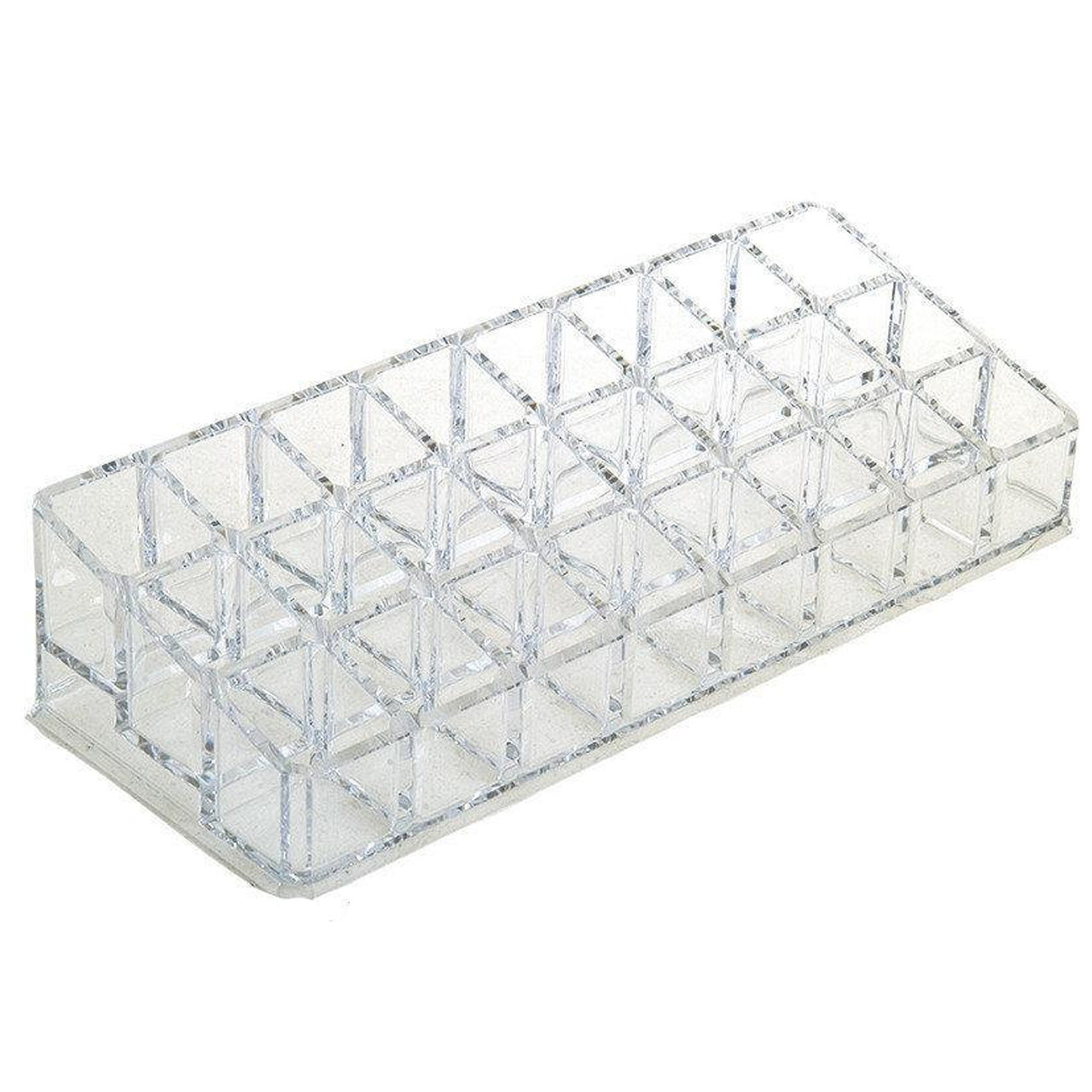 Підставка для косметики стане чудовим настільним органайзером для зберігання помад, блисків, туші та інших косметичних дрібниць. Усі 24 відділення мають однакові квадратні розміри, проте трохи відрізняються за висотою (передні відділення нижчі, задні - вищі). Підставка виготовлена з акрилу, прозора, міцна, не важка. Прямокутна форма дозволяє зручно розмістити її на будь-якому столі, не захаращуючи простір. Розміри (+/-): довжина 22,5 см, ширина 9 см, максимальна висота 5 см, кожен осередок 2,3*2,5 см.